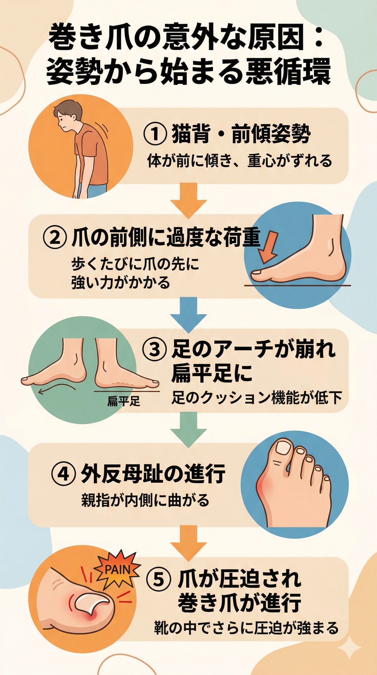 痛みから指先を使わずに歩くようになると、足裏の筋肉(アーチ)が衰えて退化してしまいます。 アーチが崩れると、地面からの衝撃を吸収できなくなり、さらに巻き爪を悪化させるという悪循環に陥ります。最悪の場合、「自力で正しく歩くこと」自体が困難になる恐れがあります。