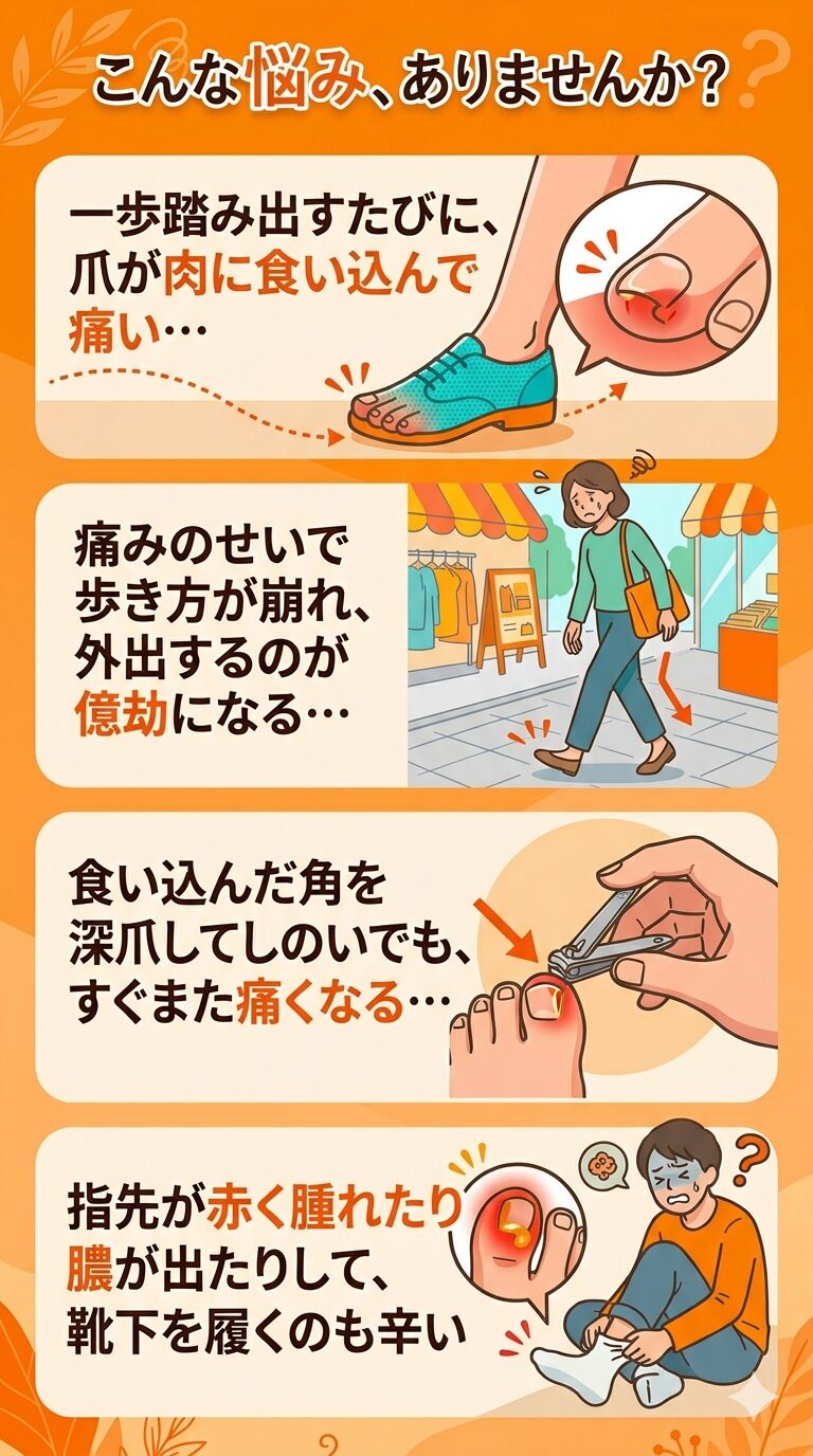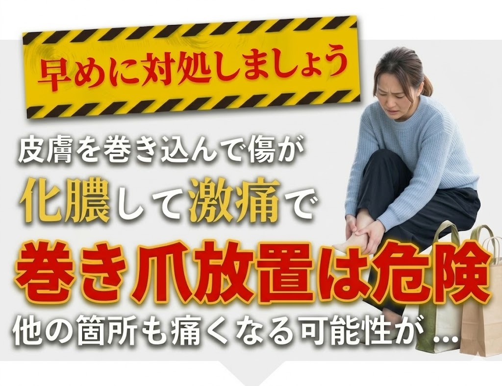爪がさらに深く食い込むと、皮膚を傷つけ、そこから細菌が入って激しい炎症や化膿を引き起こします。 こうなると、靴を履くことも、布団の重みが爪にかかることすら激痛になります。**「痛みが怖くて一歩も歩けない」**という状態になる前に、早めのケアが不可欠です。